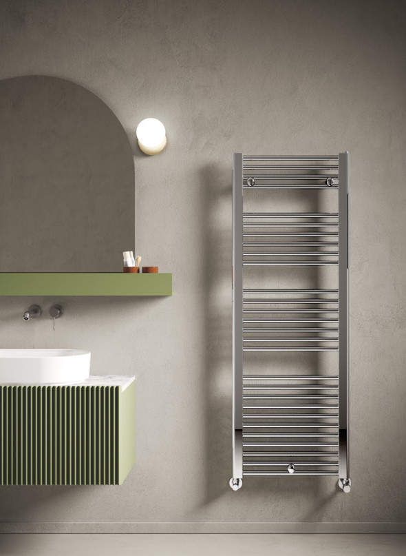 А надійна сила Ares від Irsap ховається в сталевої конструкції, яка витримує все й служить роками. Тиск 8 бар — для спокою в будь-якій системі, гібрид дозволяє працювати електро навіть влітку, без переробок. Результат? Твоя ванна без сирісті, рахунки розумні (ефективність для низьких температур), а тепло потужне — до 1200 Вт для великих моделей. У вузькій ванній модель 818x380 мм — компактна, але тепла. А в просторій — 1720x750 мм, де вся родина знайде місце для рушників. Це не примха, це практичність: сталь проти корозії, круглі трубки для рівного нагріву, і ніяких сюрпризів. Ares від Irsap розуміє життя — надійність, гнучкість, довговічний комфорт.