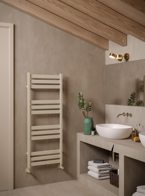 Тепер про те, як плоскі трубки Oasi від Irsap в гармонії роблять ванну візуально легшою. Овальна форма горизонтальних елементів і квадратні вертикальні колектори — це не просто дизайн, а розумний баланс: тепло йде рівномірно, рушники чіпляються зручно, а вся конструкція виглядає повітряною. Глибина 75 мм — для тих ванних, де кожен сантиметр на вагу золота, без "випирання" на стіні. Висота від 940 мм для стандартних просторів до 1640 мм для високих стель, ширина 500–600 мм — обирай під свій інтер'єр, і Oasi від Irsap стане його тихим акцентом. Уявімо білий мат у скандинавському стилі або антрацит у мінімалізмі — він не домінує, а доповнює. Монтаж легкий: бічне підключення, і все готово без зайвого шуму.