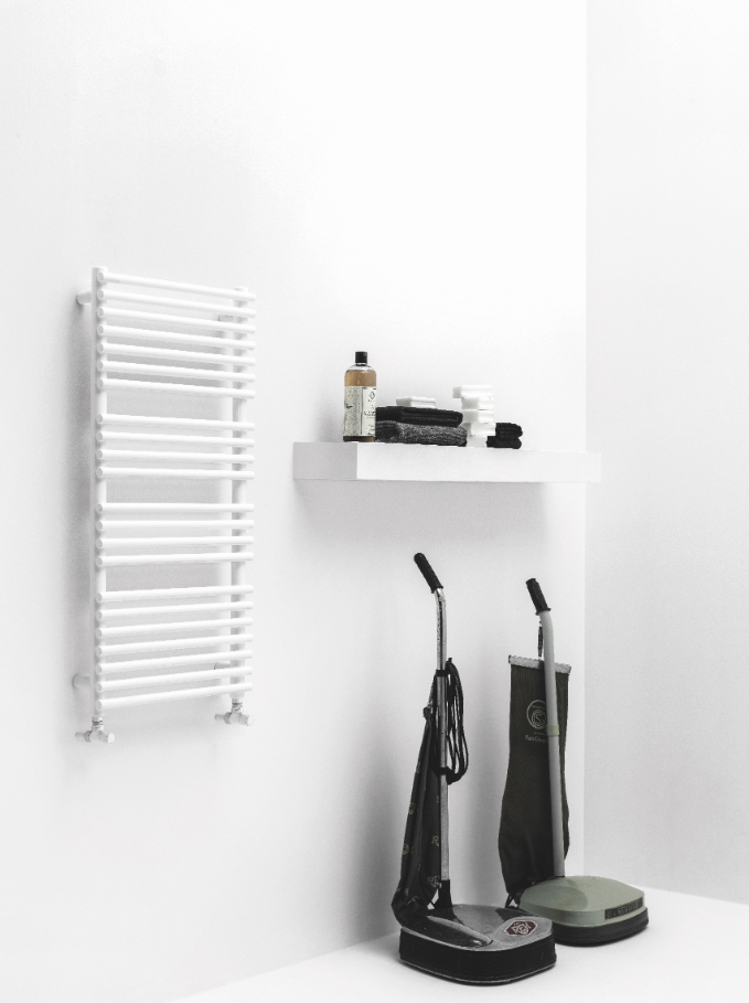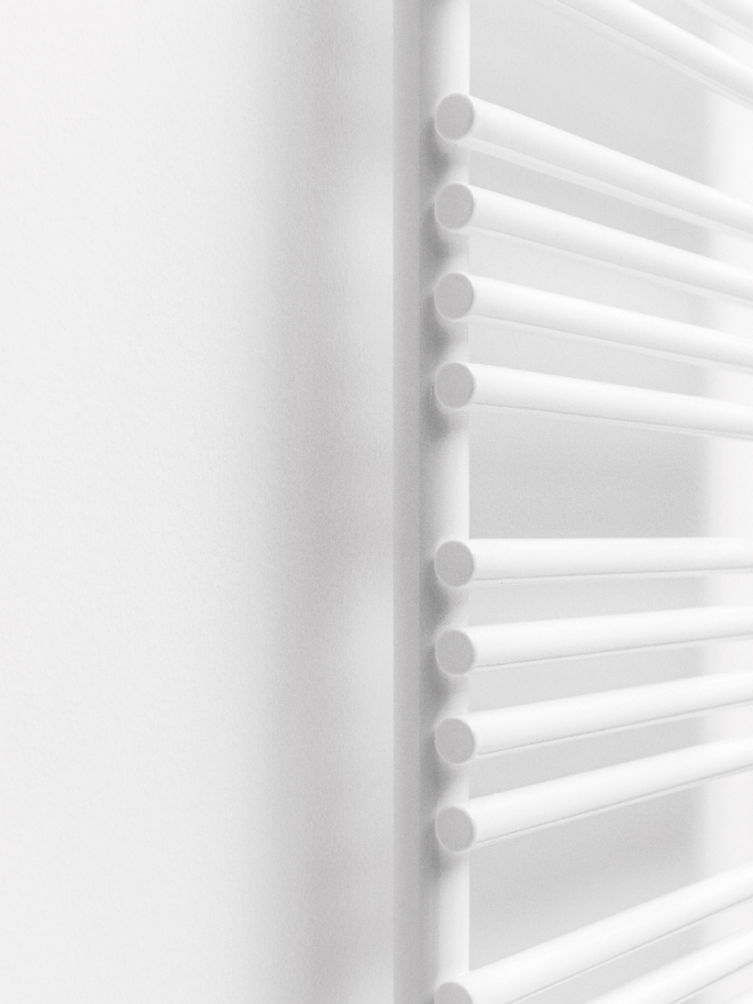Особливості: Вертикальна настінна конструкція з круглими трубками (діаметр ~22 мм), приховане підключення, сумісність із низькотемпературними системами (водяна), енергоефективність, захист IPX4 (електрична), без аксесуарів