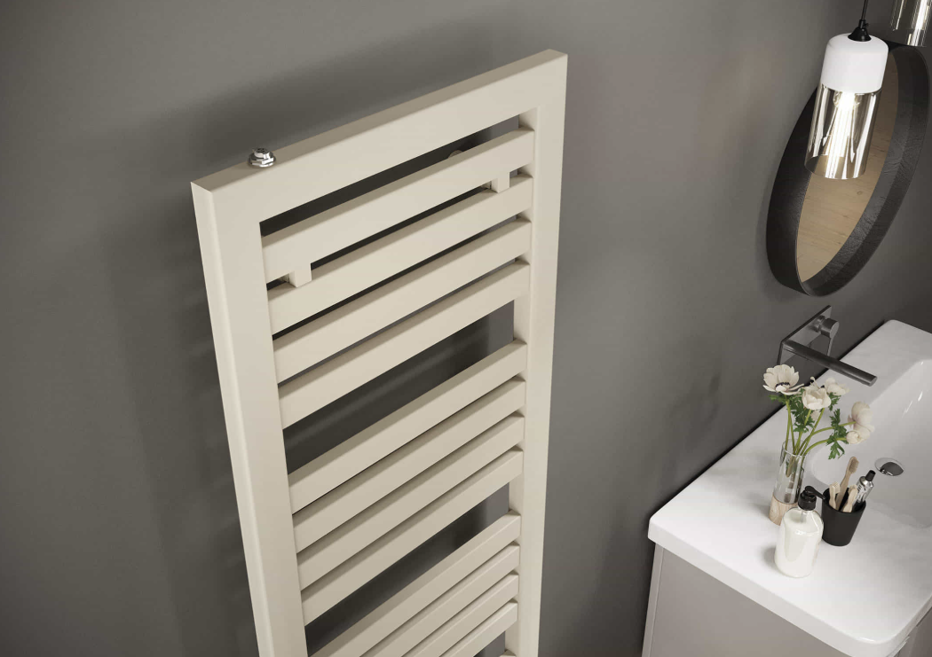 Oddo создан исключительно в водяной версии для идеальной интеграции в систему отопления. Давление до 6 бар и мощность до 1100 Вт обеспечивают быстрое нагревание, используя минимальный объем воды (~2–6 л). Глубина 92 мм делает полотенцесушитель компактным, а плоские трубки — эффективными для теплоотдачи. Oddo работает тихо, надежно и совместим с низкотемпературными системами!